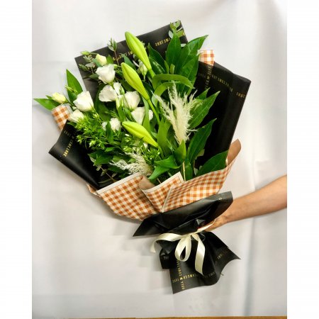 זר פרחים בגווני הלבן עטוף באריזה מיוחדת