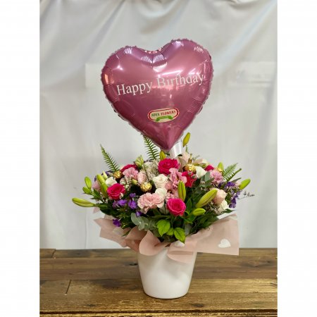 סידור בכלי קרמיקה בגווני הלבן,ורוד, סגול בתוספת בלון עם כתובית.
