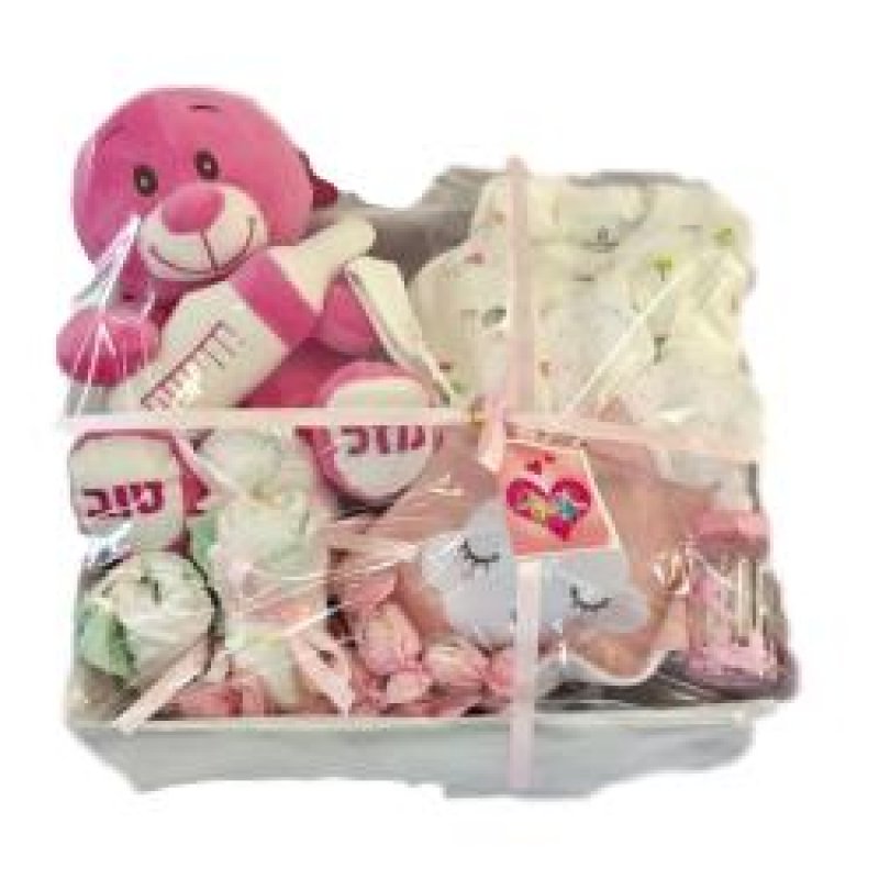 מארז לידה מפנק הכולל בתוכו דובי, חליפת תינוק, כפפות לידיים, כובע, 3 טיטולים ושוקולדים.